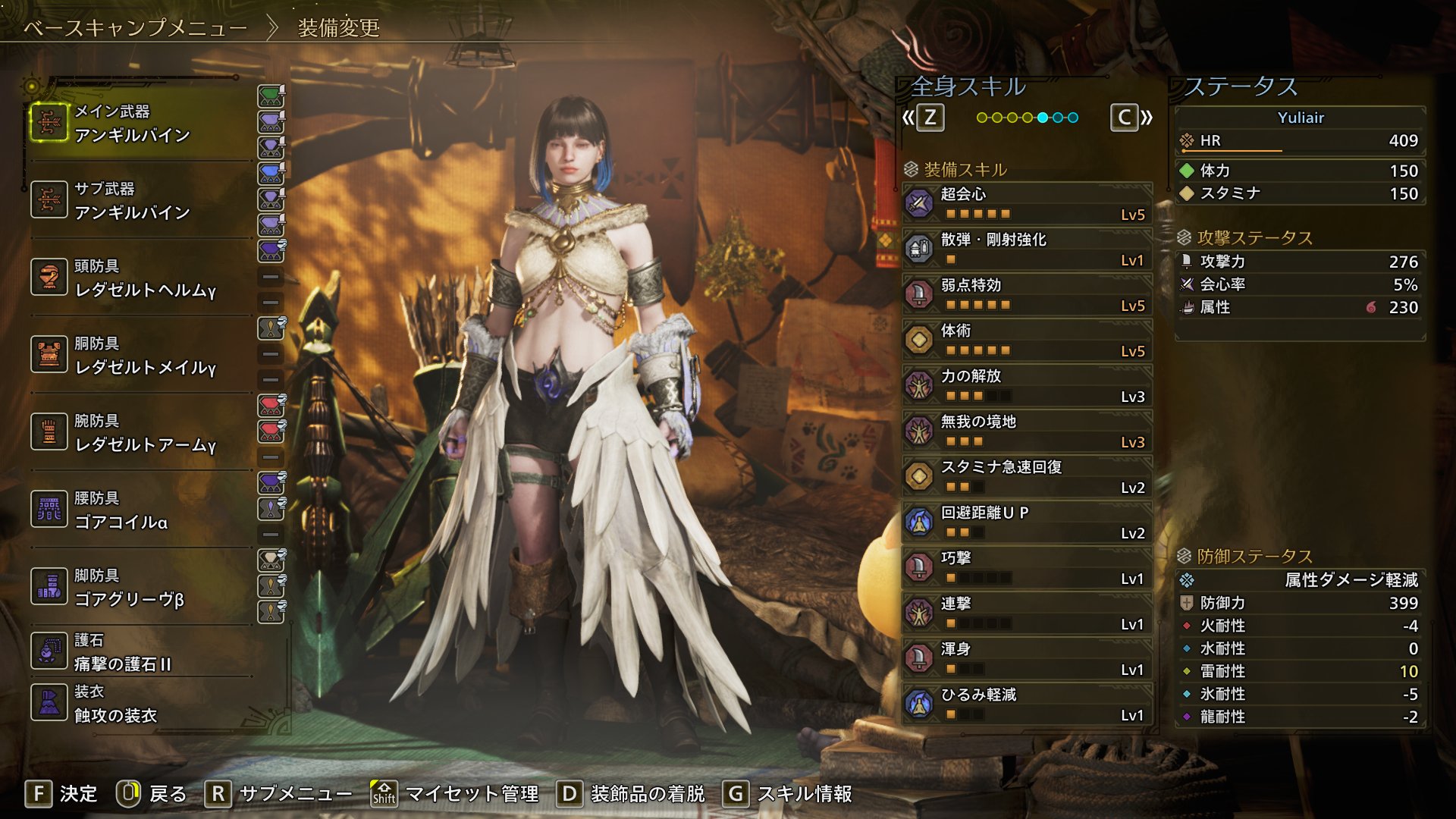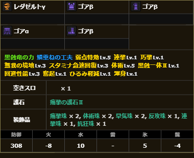 黒蝕一体Ⅰ、無我の境地3、弱点特効5、挑戦者4、体術5、スタミナ急速回復2、連撃1、巧撃1、ひるみ軽減1、回復速度2、超回復力Ⅰ