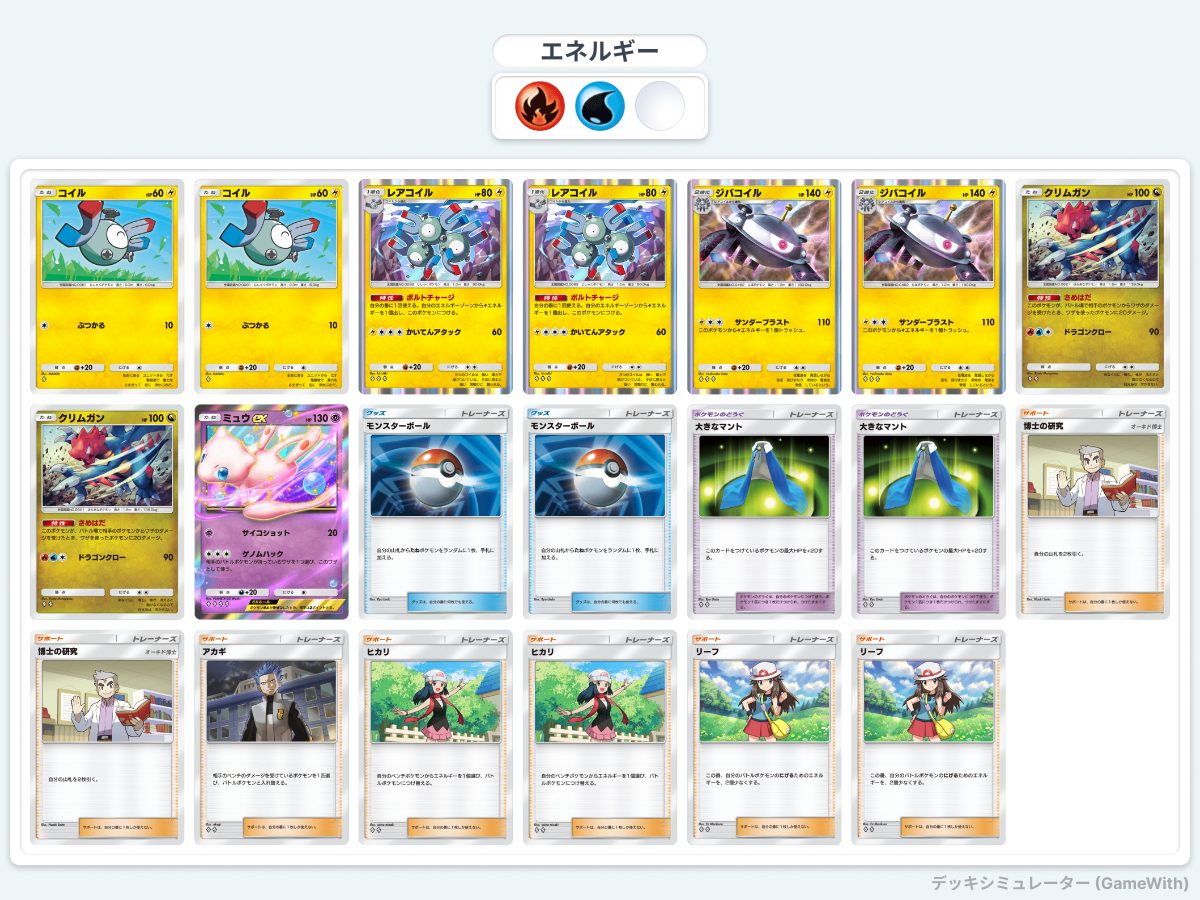 | アカギ / ナツメ | ヒカリ | 記事執筆当時パルキア,ギャラドス,セレビィがとてつもなく多かったため、メタになるミュウexを入れており、ミュウの起動を簡単にするためにヒカリを入れています。 広く環境を見るのであればアカギやナツメがおすすめです。 |