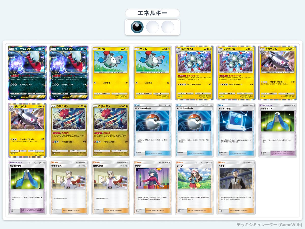 弱みは、爆発力のなさと、ダークライexが2ポイント取られてしまうところですかね。