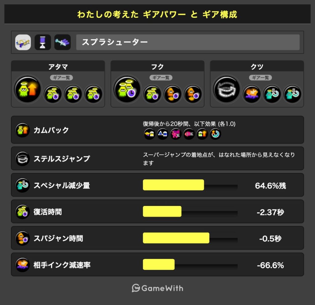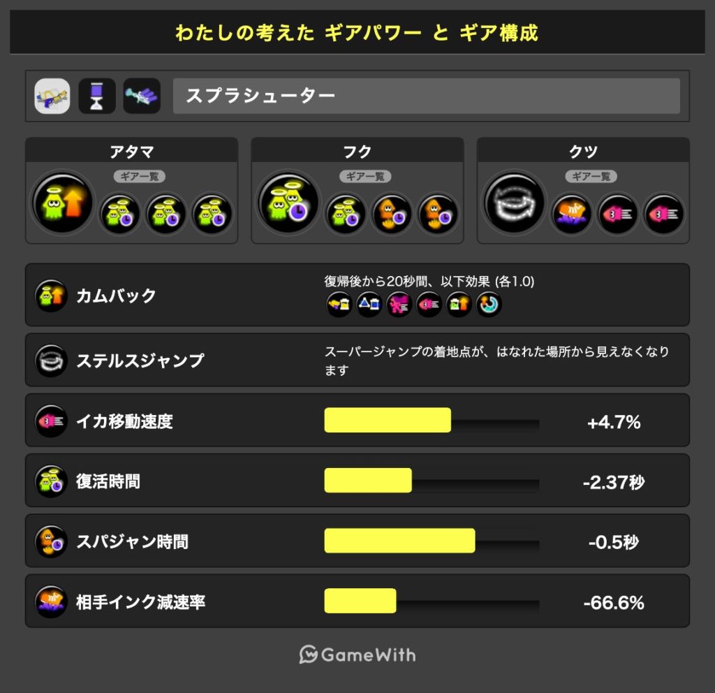 カムバックの効果発動中に自陣からイカ状態で走っていく時間はとてももったいないので、ステルスジャンプは必ず入れましょう。