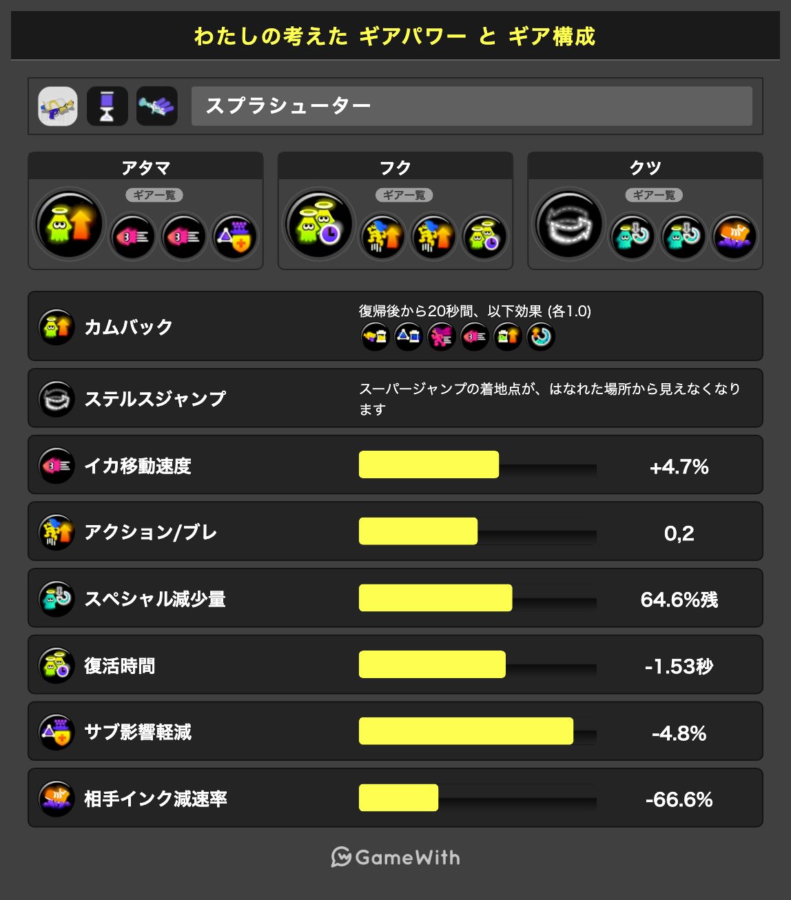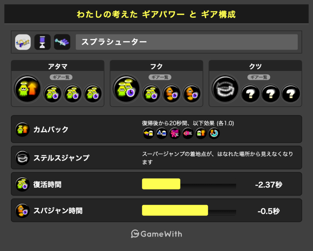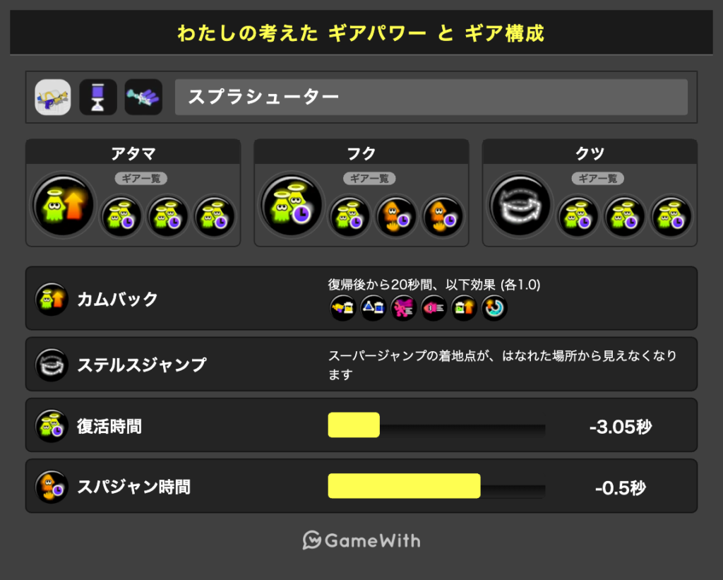 また、カムバゾンビステジャンの名前の通り、3つのギアは必須なことはわかりやすいと思いますgスーパージャンプ時間短縮0.2も復活時間の短縮に大きく貢献するため、個人的には必須だと思っております。