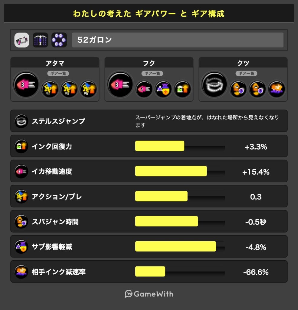 .52ガロンにおける必須ギアはアクション強化0.3とステルスジャンプくらいしかありません。