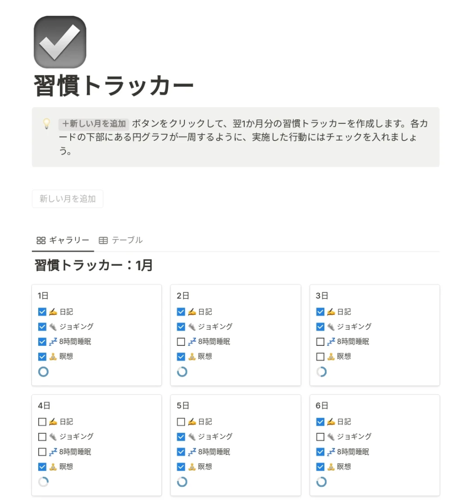 習慣を一覧化しつつ、どれだけ継続できているのかが視覚的にわかりやすくなります。